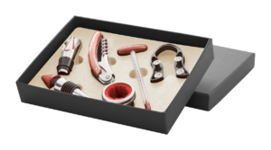 Vinski set s vadičepom u obliku boce i čepom za vakuum bocu, u crnoj poklon kutiji. Veličina: 97 × 53 × 136 mm