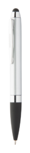 Plastična kemijska olovka sa touch screenom, sa srebrnom cijevi i obojenim gumenim držačem. S plavim punjenjem.