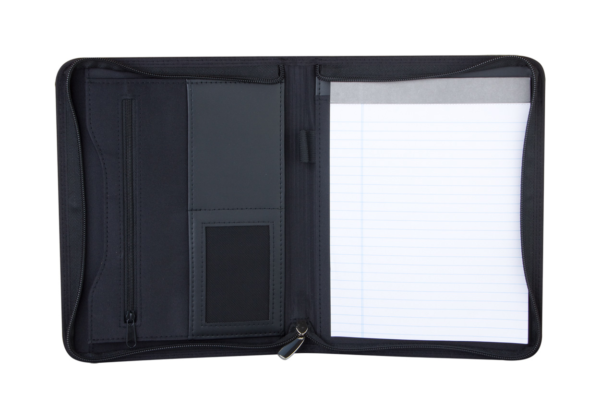 SKU: AP800332Crna koža, mapa sa dokumentima s kompaktnim dokumentima veličine A5 s 30 podmetača listova, vizitkama i držačem olovke.