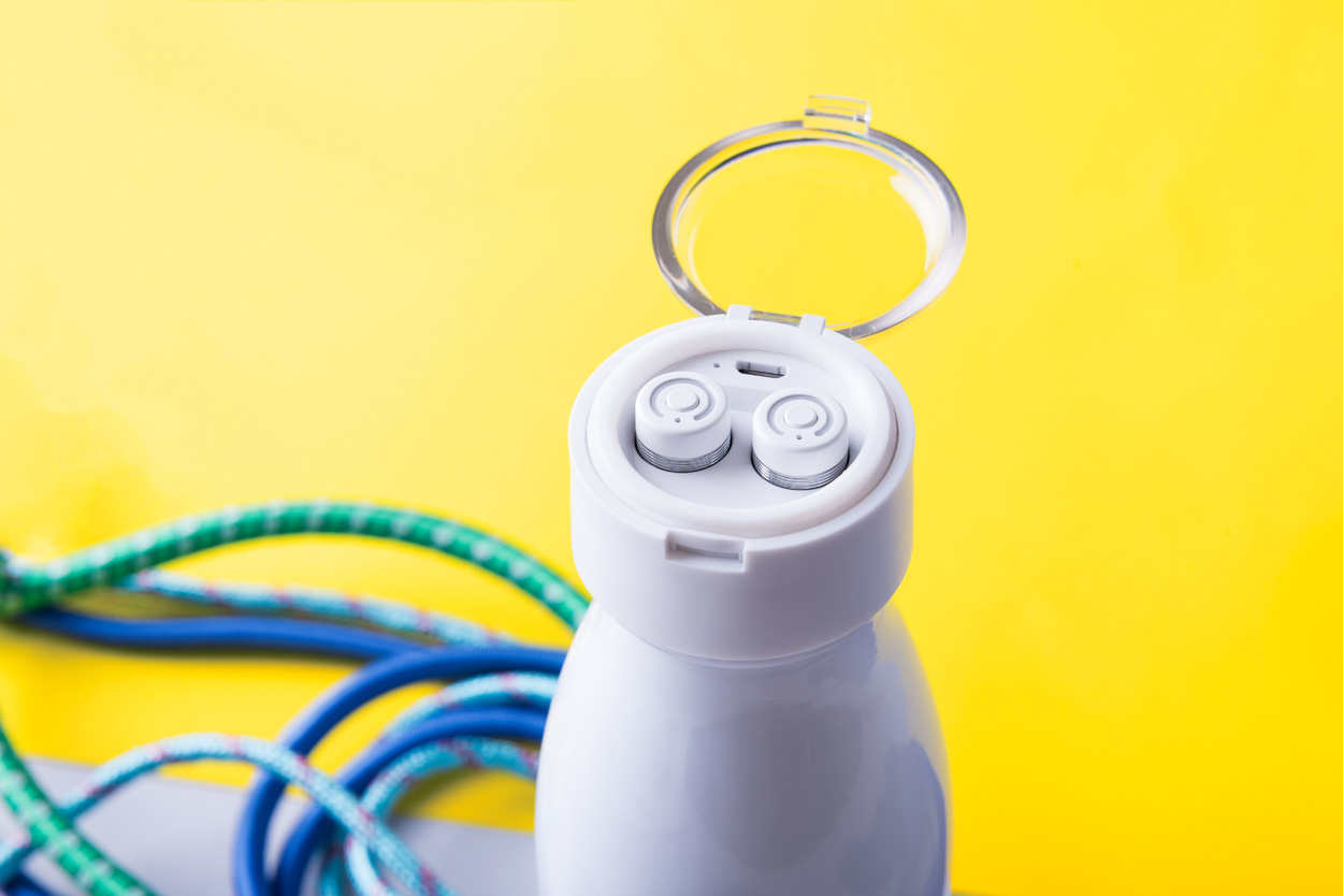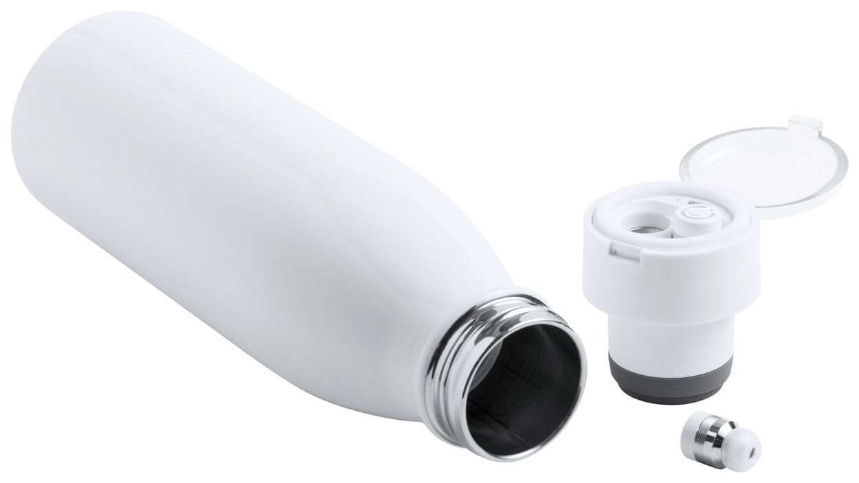 SKU: AP721067-01Sportska bočica od nehrđajućeg čelika s ugrađenim bluetooth slušalicama na kapici, s funkcijom hands-free poziva. U poklon kutiji, uključujući i kabel USB punjača. 580 ml.