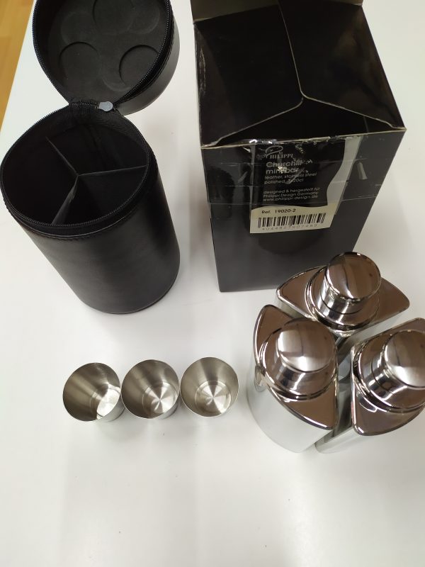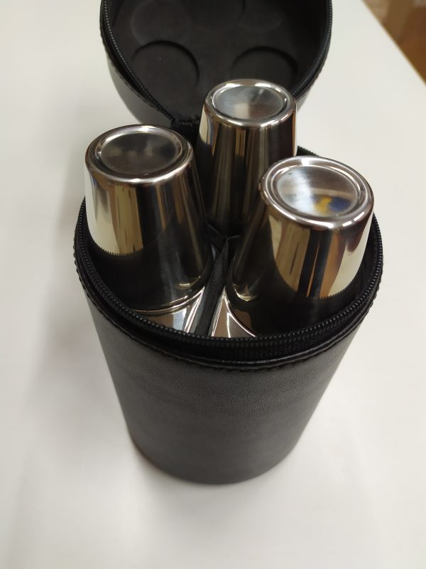 SKU: 19020-2Elegantni poklon mini bar sa 3 pljoske i 3 čašice od kvalitetnog nehrđajućeg čelika u kožnom etuiu brenda Philippi design.